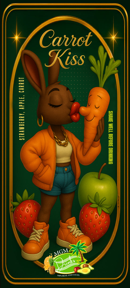 Carrot Kiss is a naturally sweet, velvety blend of fresh carrots, ripe strawberries, and crisp apples — a flavor combination as delicious as it is nutritious. This cold-pressed beauty is loaded with beta-carotene, Vitamin C, and antioxidants to support healthy skin, boost your immune system, and promote overall wellness.