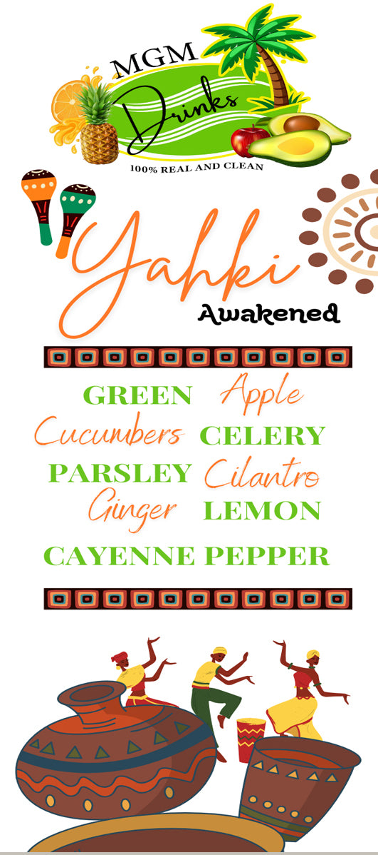 Yahki Awakening is a bold, detoxifying green juice crafted to restore balance and renew your energy from the inside out. Made with fresh green apples, cucumber, lemon, parsley, cilantro, celery, and a touch of cayenne, this powerful blend is packed with antioxidants, chlorophyll, and natural cleansing agents.
